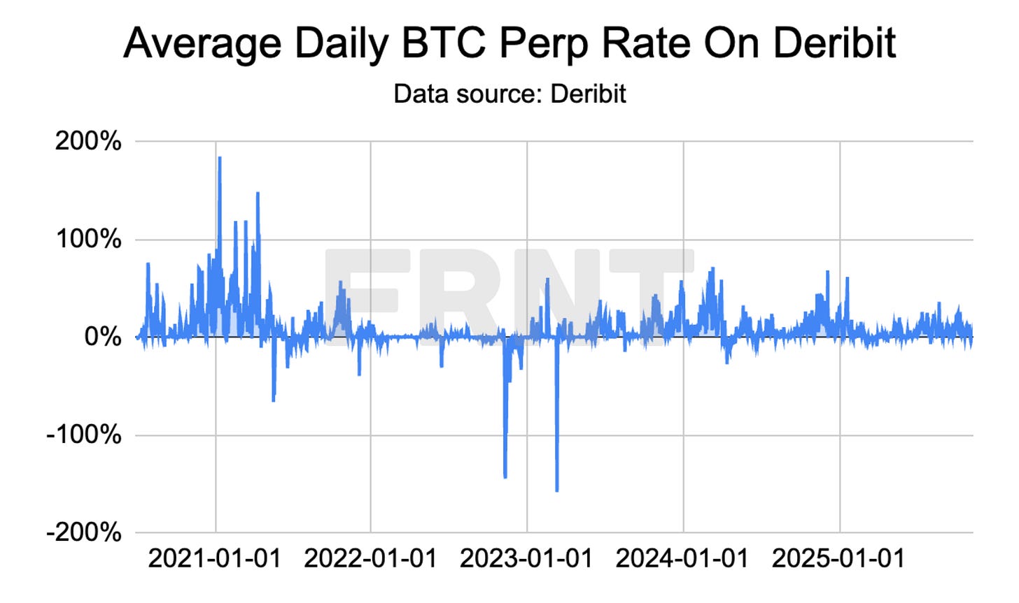 BTC perp rates on Deribit remain subdued in the latter half of 2025, especially compared to 2021.