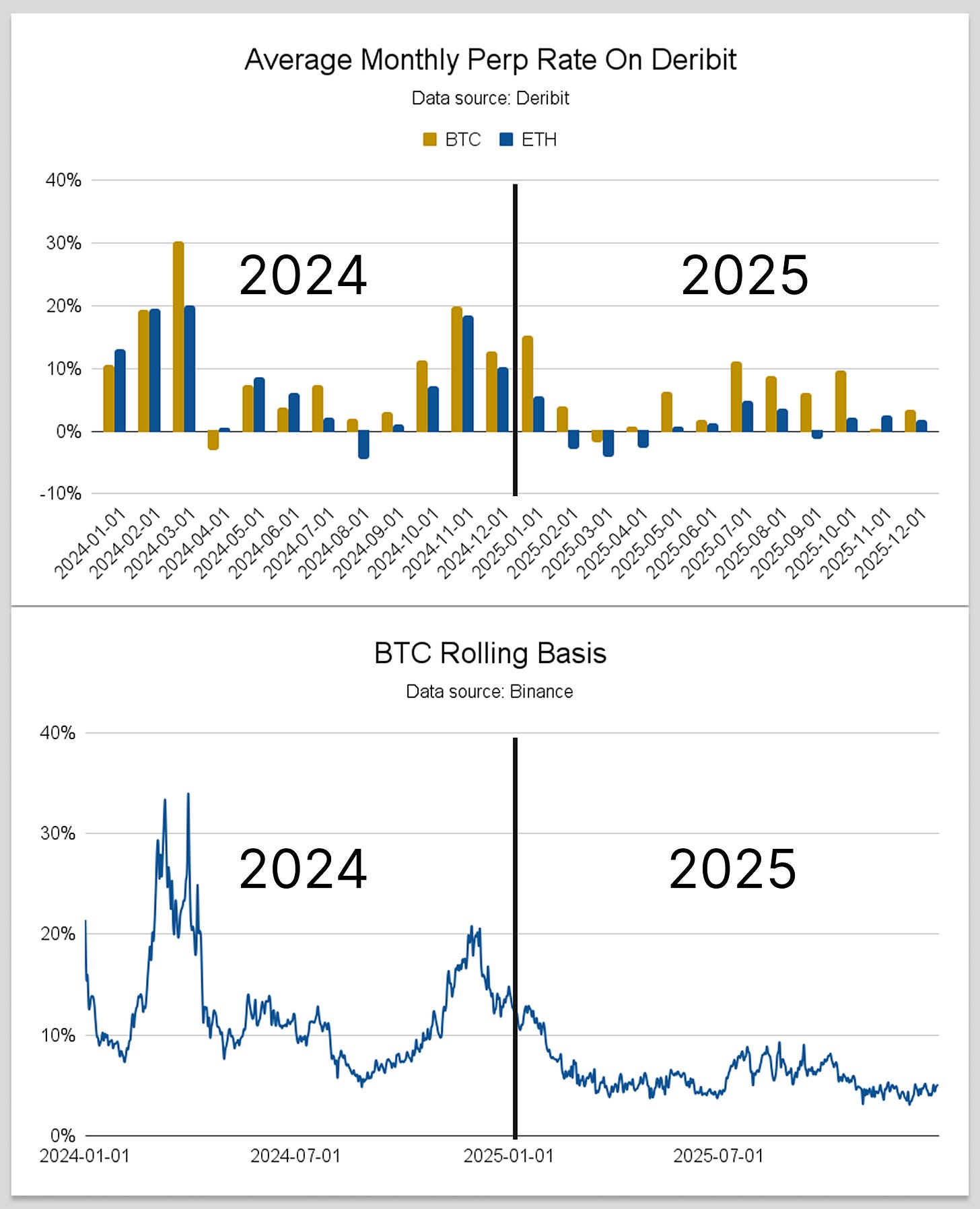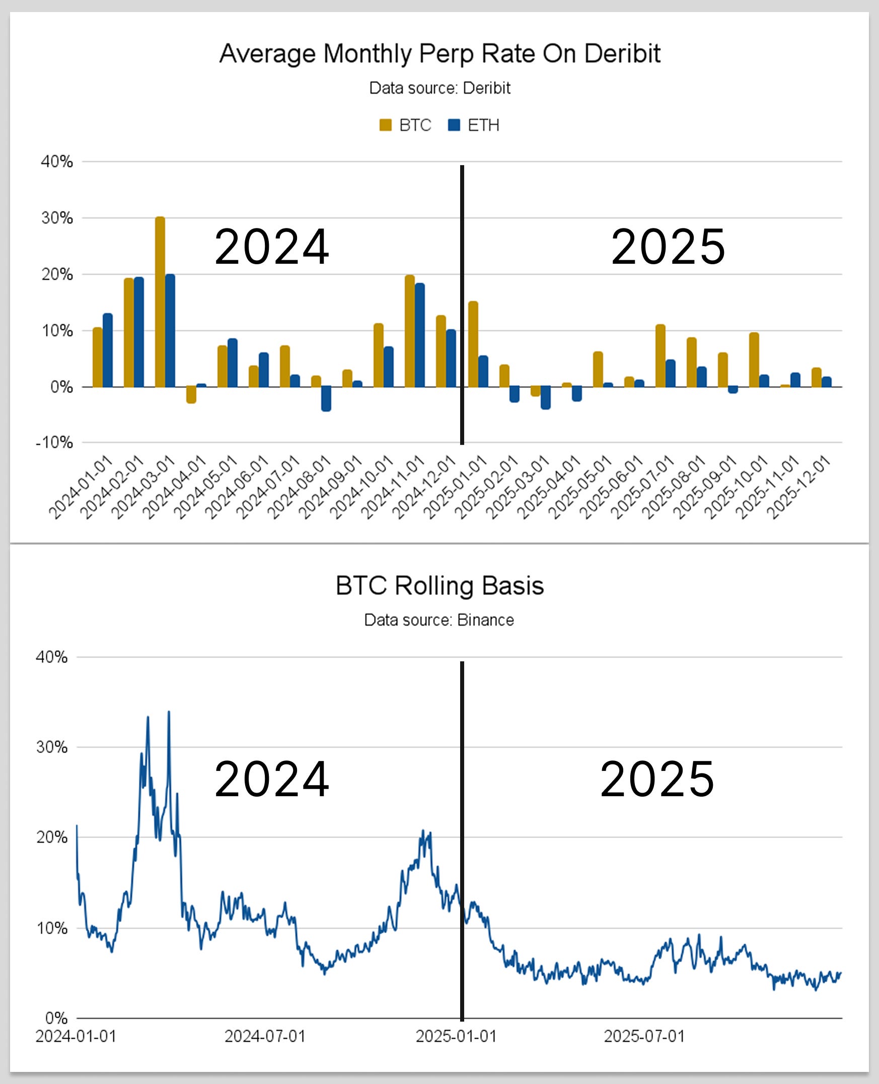 Core leverage metrics indicate benign dynamics in 2025 compared to 2024: During the two years, the highest average daily BTC perp rate on Deribit was 71.73%, recorded in March 2024. This level was achieved on the back of strong US BTC ETF inflows, which had surprised many market commentators in their magnitude, and the asset breaking above its 2021 record high. BTC perp rates spiked again at the end of 2024, reaching 68.20% in December when BTC broke the psychologically significant price of USD 100,000 on the back of President Trump’s election win. Overall, BTC perp rates on Deribit averaged 10.24% in 2024, compared to 5.38% in 2025. Last year, the metric peaked early in the year, reaching 61.49% in January 2025. However, this January peak was more a spill-over from the year prior given that leverage dynamics in 2025 largely failed to materialize in the manner they did in 2024; outside of January, BTC perp rates on Deribit peaked in August, reaching 36.09%. Rolling BTC basis corroborates this view, with the metric reaching 33.94% in March 2024 and remaining below 10% for most of 2025. ETH perp rates on Deribit followed a relatively similar pattern, averaging 8.20% in 2024 and just 0.85% last year. It is also worth noting that perp rates in 2024 remained well below levels seen in 2021, when BTC and ETH rates on Deribit reached 190.25% and 184.88%, respectively.