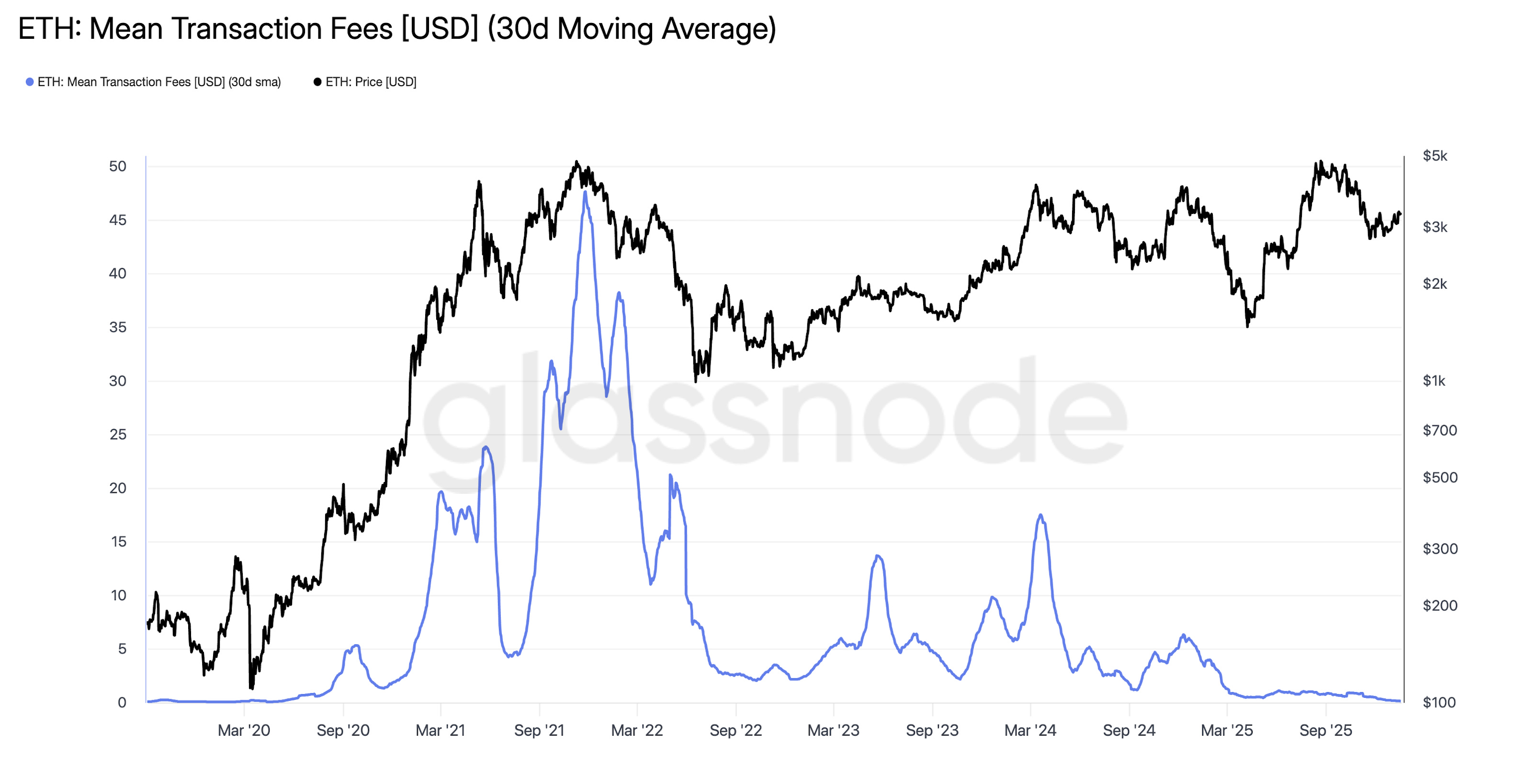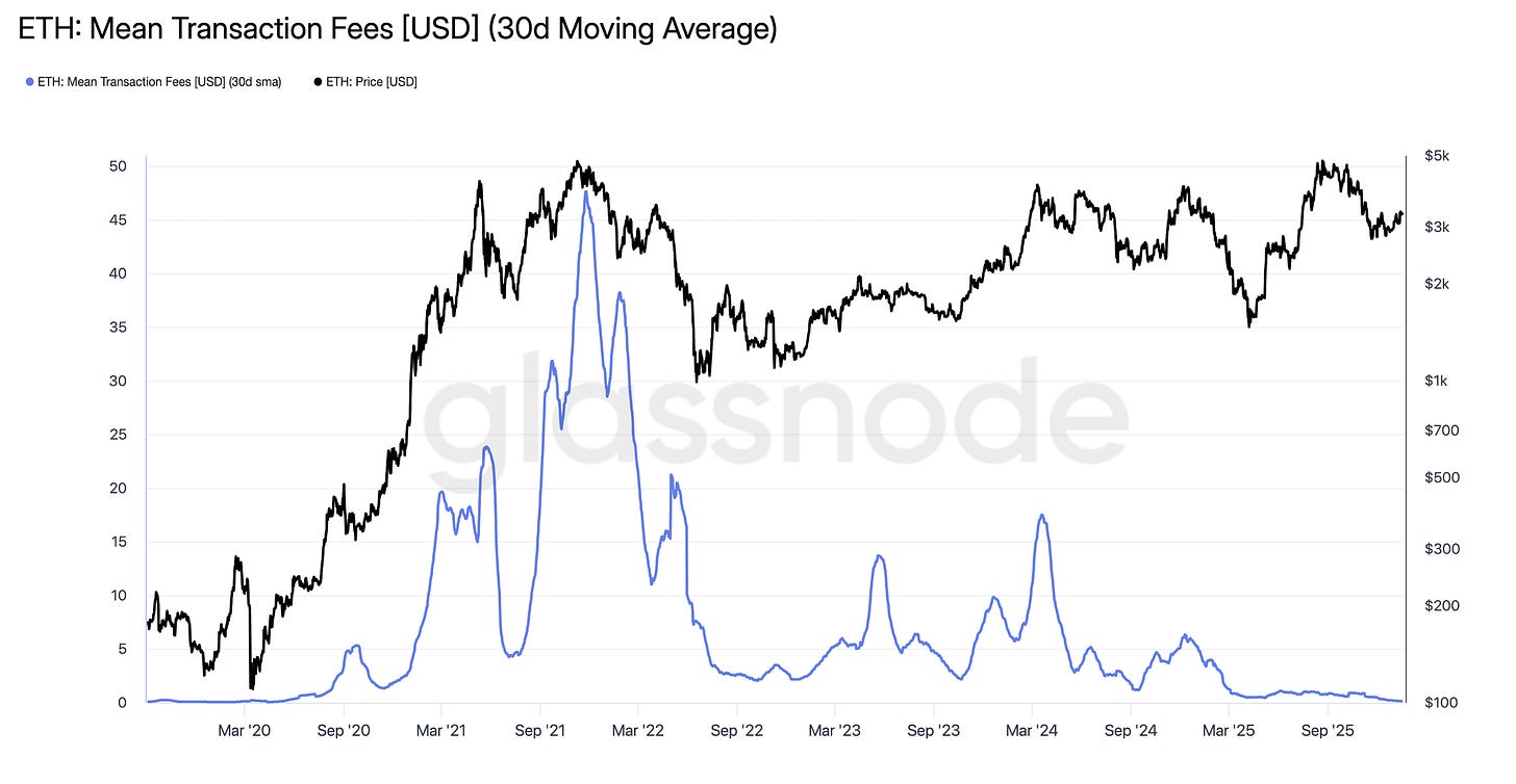 The average transaction fee on the Ethereum network remains low, in line with trends over the past year, despite a significant uptick in usage metrics.