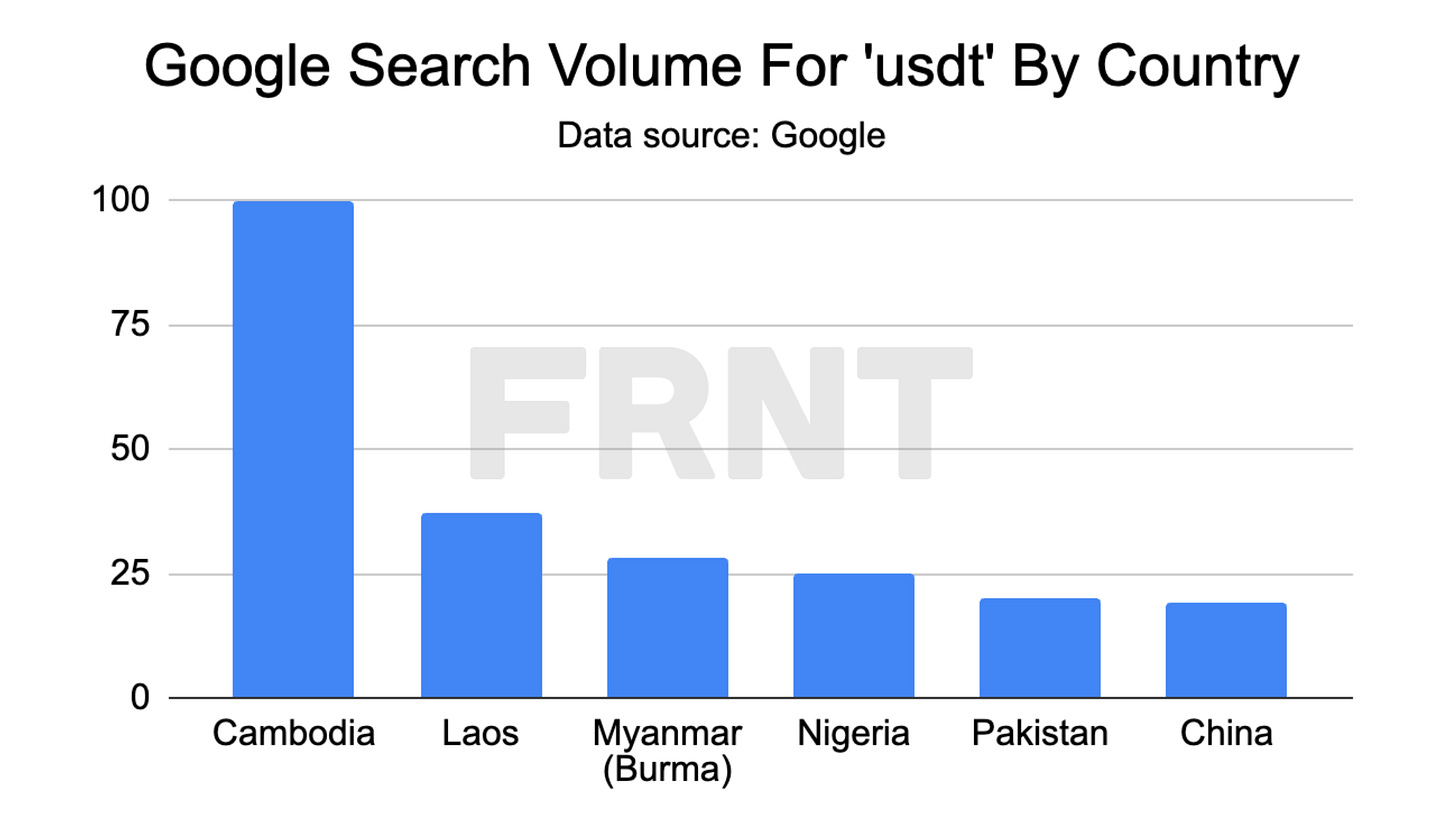 Interest in USDt, measured via Google searches for the stablecoin, is highest in countries where traditional access to US dollars is strained.