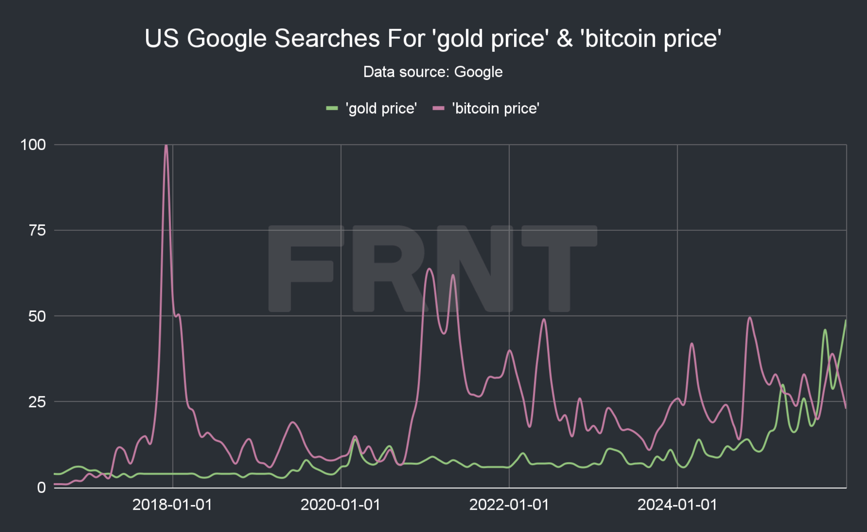 In the US, Google searches for ‘gold price’ surpassed those for ‘bitcoin price’ in April 2025 for the first time since June 2020.