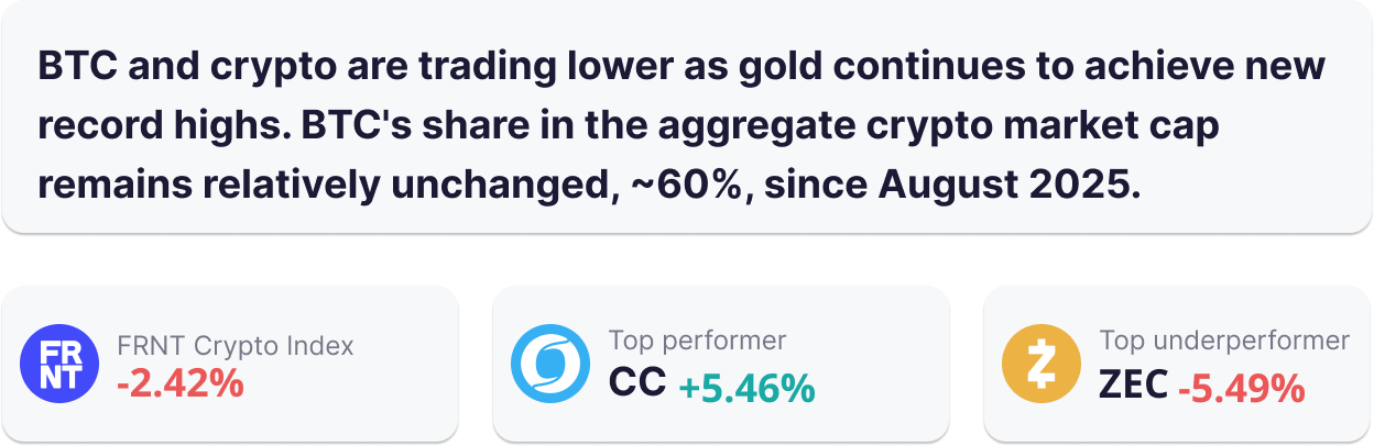 Gold’s growing role in the crypto space: In a broad interview with Bloomberg with Tether CEO Paolo Ardoino, the news outlet placed the firm’s gold holding at 140 tons, worth USD ~25B. Considering that a portion of this gold backs Tether tokenized gold product XAUt, the remaining USD ~22.4B represents 12% of USDt’s market cap. As of Tether’s Q3 2025 attestation report, 7.41% of USDt’s market cap market cap was backed by gold. According to Bloomberg, Tether is now ‘the world’s largest known hoard of bullion outside of banks and nation states.’ Besides gold’s growing backing of the largest stablecoin, Ardoino told Bloomberg that he believes countries currently ‘buying a lot of gold…will soon launch tokenized version of gold as a competitive currency to the US dollar.’ As we pointed out yesterday, this is already taking place: In December, Bhutan and Kyrgyzstan launched tokenized gold products. Crypto proponents believe that tokenized gold can endow the precious metals with new capacities, such as peer-to-peer transferability or access to crypto native financial services. For example, holders from emerging markets where financial services may be deficient will be able to borrow against tokenized gold in a manner not possible with physical precious metal. Ardoino told Bloomberg he foresees there is a ‘good chance’ that XAUt can end 2026 with a market cap from USD 5B to 10B; XAUt’s current market cap is USD 2.6B.