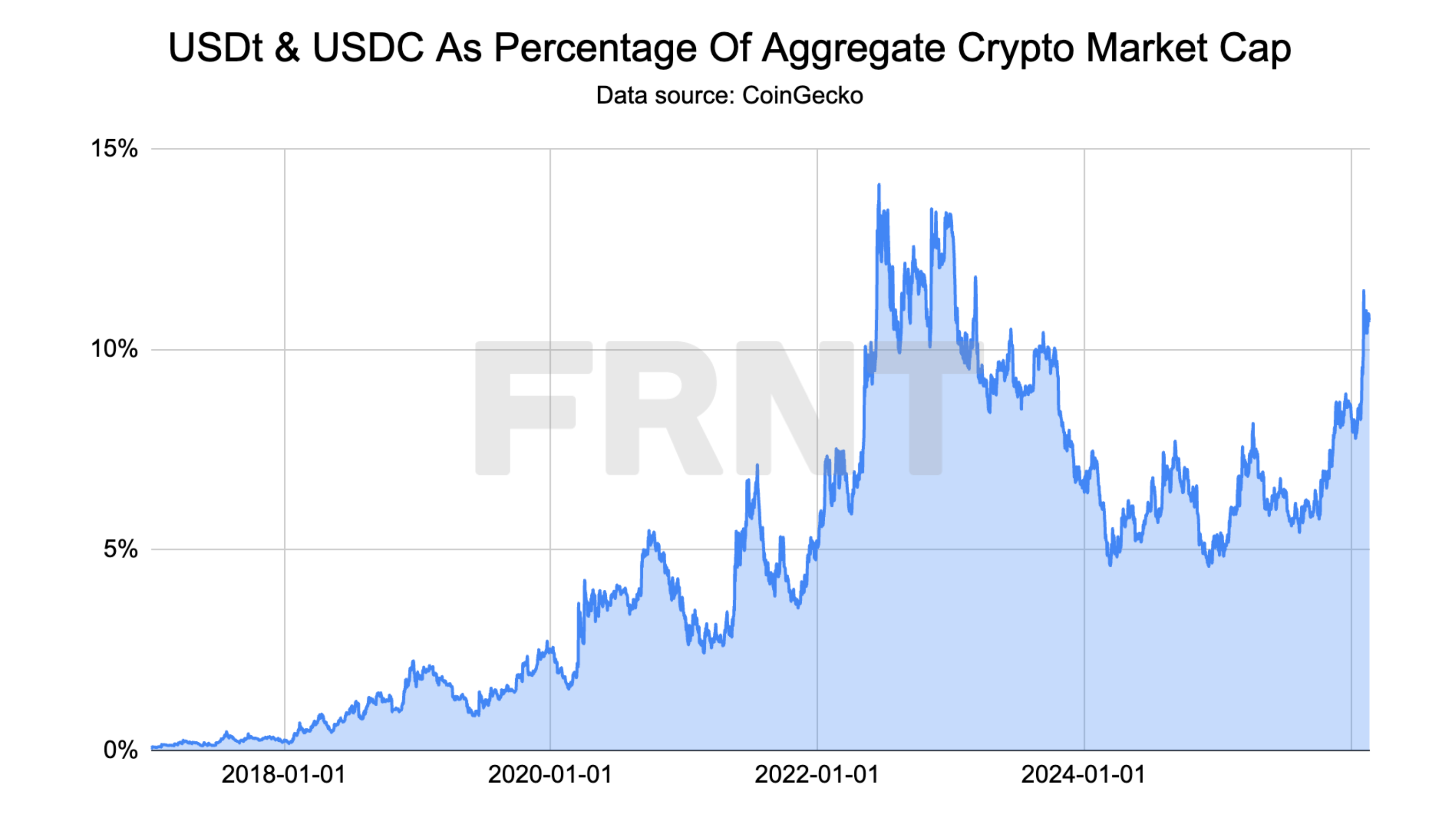 USDt and USDC’s combined market cap reached ~11% of the aggregate crypto market cap at the start of the month, its highest level since March 2023.